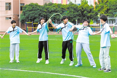 近日,湖北省襄陽(yáng)市諸葛亮中學(xué)教育集團(tuán)組織九年級(jí)學(xué)生在操場(chǎng)上傳遞呼啦圈。當(dāng)日,該校開(kāi)展“快樂(lè)減壓 笑迎中考”考前系列減壓活動(dòng),緩解學(xué)生考前緊張焦慮情緒。付曉方 攝