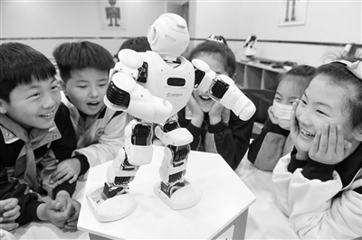 | ③安徽省阜陽市潁東區(qū)和諧路小學學生在科技興趣課堂上觀看機器人演唱歌曲和表演“功夫”。王彪 攝 |
