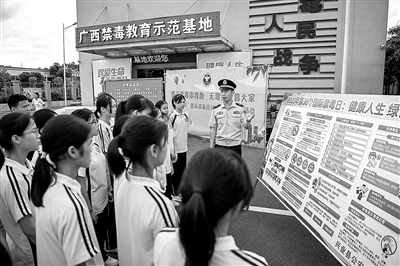 6月19日,在廣西禁毒教育示范基地,民警在做禁毒宣傳。在第36個(gè)國(guó)際禁毒日來(lái)臨前,廣西興業(yè)縣禁毒整治辦聯(lián)合教育局、公安局在位于該縣城區(qū)的廣西禁毒教育示范基地對(duì)學(xué)校師生開展禁毒宣傳活動(dòng),增強(qiáng)廣大師生們的識(shí)毒、防毒、拒毒意識(shí)。