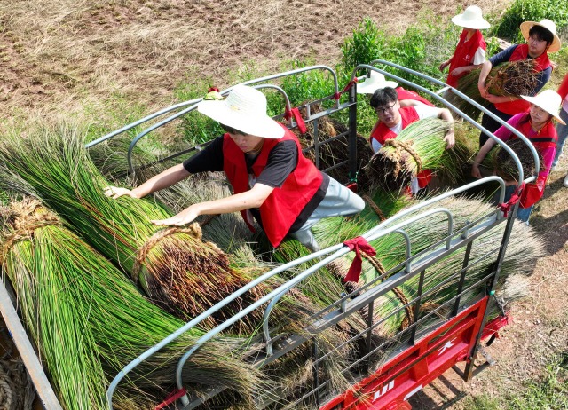 6月28日,在湖南省衡陽市祁東縣金橋鎮(zhèn),南華大學電氣工程學院的志愿者將收割的藺草裝車(無人機照片)。