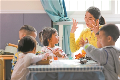 2019年以來,貴州省黔西市不斷落實(shí)生育政策和人口工作,遵循0—3歲嬰幼兒發(fā)展特點(diǎn)和規(guī)律,在人口密集的社區(qū)開辦托育點(diǎn),對(duì)嬰幼兒進(jìn)行科學(xué)早教。同時(shí),定期舉辦家長輔導(dǎo)班,更新家長育兒理念,促進(jìn)嬰幼兒身心健康成長。圖為蓮城社區(qū)托育中心的幼兒和教師一起做手指操。