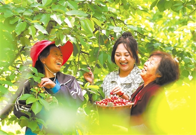 今年60歲的張魁英家有10畝櫻桃園、300棵左右櫻桃樹,是寨子村最早栽種櫻桃的人?!耙郧胺N的土櫻桃存放時間短、果形小,掙不上錢。多虧有科技特派員的技術指導,我們的品種也換了,不愁銷路?!北M管搶摘櫻桃很忙,但張魁英的臉上始終掛滿著笑容。