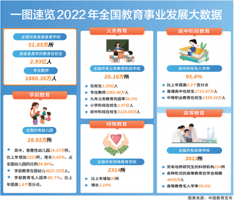本報北京7月5日訊(記者 林煥新)今天,教育部發(fā)布2022年全國教育事業(yè)發(fā)展統(tǒng)計公報。公報顯示,全國共有各級各類學校51.85萬所,各級各類學歷教育在校生2.93億人,專任教師1880.36萬人。