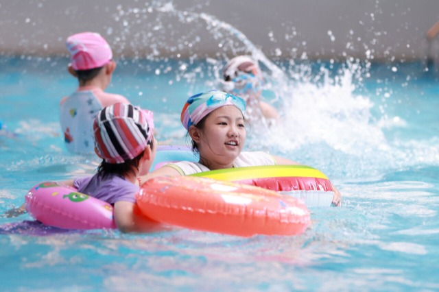 7月6日,孩子在河北省邢臺市內(nèi)丘縣雪嵐全民健身中心戲水游玩。近期持續(xù)高溫天氣,當(dāng)?shù)睾⒆蛹娂娺x擇水上娛樂活動消暑健身,樂享夏日清涼。劉繼東 攝