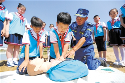 近日,在山東省臨沂市沂南縣界湖公園,救援隊(duì)志愿者為學(xué)生講解心肺復(fù)蘇急救知識(shí)。暑假來(lái)臨,當(dāng)?shù)馗髦行W(xué)開(kāi)展暑期防溺水安全教育活動(dòng)。志愿者們通過(guò)講解防溺水知識(shí)、傳授安全急救技能、開(kāi)展警示教育等形式,提升學(xué)生的安全意識(shí)和自救能力。王彥冰 丁曉彤 攝