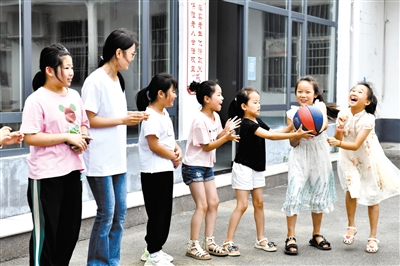 7月26日,在莒縣龍山鎮(zhèn)東樓村“小草學堂”,孩子們在哈爾濱理工大學志愿者的帶領(lǐng)下做游戲。