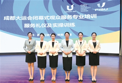 林莉是成都大運會聘請的專業(yè)培訓(xùn)講師之一,負責相關(guān)人員的禮儀培訓(xùn)。今年3月,她就受邀參與成都大運會觀眾服務(wù)教材的編寫,同時還帶領(lǐng)團隊先后為開閉幕式志愿者、觀眾服務(wù)志愿者、大運村志愿者、世界學術(shù)大會志愿者和部分城市志愿者進行服務(wù)禮儀專項培訓(xùn)20余次。成都大運會上萬名志愿者和工作人員,都是林莉的“學生”。