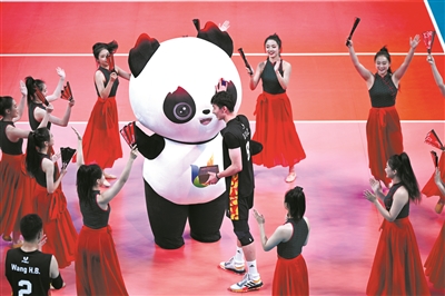 | 8月7日是中國隊球員李詠臻(中)的生日,現(xiàn)場工作人員及吉祥物“蓉寶”為他慶生。新華社記者 胥冰潔 攝 |