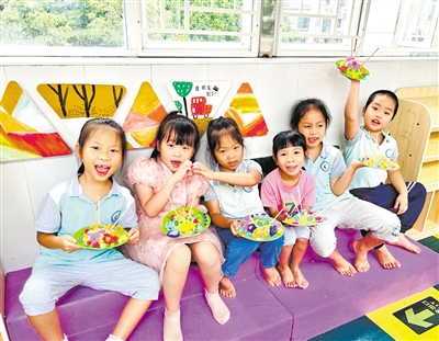今年暑期,廣州工控幼教組織屬下18所幼兒園和1所托育中心開(kāi)展暑期托管服務(wù)。此項(xiàng)服務(wù)已連續(xù)開(kāi)展3年,多元趣味的課程、豐富多彩的活動(dòng),深受幼兒和家長(zhǎng)的歡迎。圖為廣鋼科城山莊幼兒園參加暑期托管的孩子們,正在展示自己的手工作品。陳麗蕓 攝
