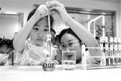 8月11日,浙江省湖州市長(zhǎng)興縣食品藥品檢驗(yàn)檢測(cè)中心實(shí)驗(yàn)室,小朋友在工作人員指導(dǎo)下進(jìn)行定容科普實(shí)驗(yàn)。暑假期間,浙江省湖州市長(zhǎng)興縣食品藥品檢驗(yàn)檢測(cè)中心開(kāi)展科普研學(xué)活動(dòng),學(xué)生們?cè)趯?shí)驗(yàn)室內(nèi)參與手指測(cè)菌、會(huì)呼吸的酵母菌、蔬菜水果農(nóng)殘快檢等沉浸式趣味科普小實(shí)驗(yàn),以“玩”促“學(xué)”,寓教于樂(lè),學(xué)習(xí)食品安全知識(shí)。