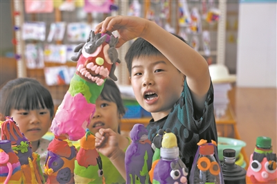 日前,浙江省諸暨市暨南街道街亭幼兒園的孩子們用各種彩泥制作成蝸牛、毛毛蟲(chóng)、棒棒糖等,裝飾廢舊瓶子、扇子,培養(yǎng)了動(dòng)手能力和想象力,提升了環(huán)保意識(shí)。圖為孩子們?cè)谡故居貌誓嘌b飾的瓶子。陳霞芳 攝