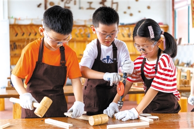 8月22日,在安徽省蕪湖市繁昌區(qū)城關(guān)幼兒園木工坊,暑托興趣班的孩子們使用各種木工工具分組開展創(chuàng)意木工活動?;顒又荚谂囵B(yǎng)孩子們形成專注、協(xié)助、自主、有序和探究的“工匠精神”。田園園 攝