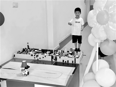 我們還投放了數(shù)智化建構(gòu)材料,孵化出多種探究未來的學(xué)習(xí)方式。比如,機器人材料,幼兒可以自主設(shè)計游戲規(guī)則,探究機器人行進路線。如在設(shè)計“叢林探險”游戲時,幼兒有許多新奇的想法:需要讓機器人穿越多條路線;得有起點和終點……在創(chuàng)設(shè)路徑時,幼兒用旗幟卡作為起點,用獎杯卡作為終點,通過機器人識別系統(tǒng),成功解決了問題。