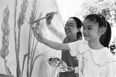日前,在江蘇省鎮(zhèn)江市平山村,江蘇大學(xué)志愿者帶著小朋友一起在墻上描繪“美麗鄉(xiāng)村”主題畫。石玉成 攝
