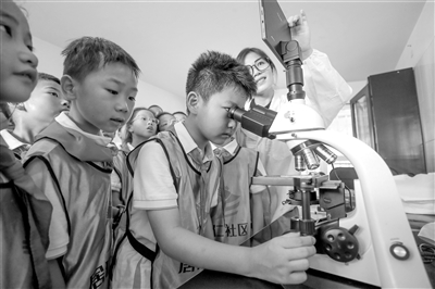 近日,浙江省湖州市德清縣武康街道組織當(dāng)?shù)馗餍?0多名小學(xué)生走進(jìn)德清縣污水處理教育基地,通過近距離實(shí)地考察,深入了解污水處理的全過程,增強(qiáng)保護(hù)生態(tài)環(huán)境的意識。圖為小學(xué)生借助顯微鏡觀察活性污泥中的微生物,直觀地了解各種微生物的名稱和形狀。通訊員 王正 攝