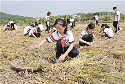 9月4日,湖南省邵陽(yáng)市洞口縣黃橋鎮(zhèn)黃橋村,學(xué)生在撿拾被收割機(jī)遺漏的稻穗。黃橋鎮(zhèn)中心小學(xué)組織學(xué)生到附近收割后的稻田里撿拾散落的稻穗,培養(yǎng)學(xué)生熱愛勞動(dòng)、珍惜糧食、厲行節(jié)約的良好習(xí)慣。