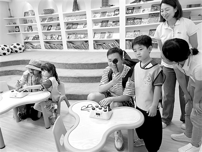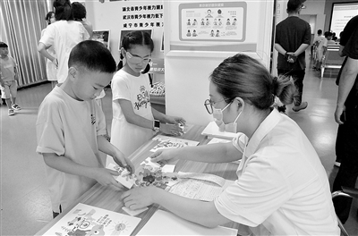 “檢測(cè)完了?先聽個(gè)簡(jiǎn)單的講座,再到這玩闖關(guān)游戲?!毕虒幰暦乐行挠泻脦讓樱畮讉€(gè)大學(xué)生志愿者忙著引導(dǎo)學(xué)生和家長(zhǎng)參與各種活動(dòng)。