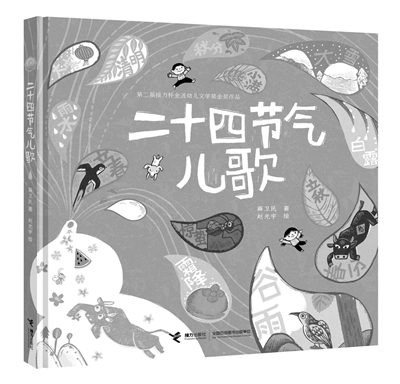 “節(jié)氣里的詩(shī)意氣韻”這個(gè)表達(dá)來(lái)自薛衛(wèi)民的一篇短文。這位對(duì)二十四節(jié)氣保持著長(zhǎng)久的興趣和關(guān)注的作者,曾深情地凝視節(jié)氣文化,嘗試將“萬(wàn)物有靈”的浪漫和“春華秋實(shí)”的質(zhì)感以兒歌的方式予以呈現(xiàn)。其實(shí),自2016年入選世界非文化遺產(chǎn)名錄以來(lái),二十四節(jié)氣已成為童書(shū)中極為熱門的表現(xiàn)內(nèi)容。在這樣的背景下,《二十四節(jié)氣兒歌》要將耳熟能詳?shù)摹按河牦@春清谷天,夏滿芒夏暑相連。秋處露秋寒霜降,冬雪雪冬小大寒”轉(zhuǎn)化為兒歌,“用文學(xué)的光,讓孩子看得更遠(yuǎn)”,分明是對(duì)寫作智慧和文字功力的考驗(yàn)和挑戰(zhàn)。