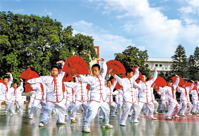 9月15日,四川省華鎣市祿市鎮(zhèn)占云小學的學生在大課間練習“太極功夫扇”。該校把武術(shù)引入校園,開設(shè)太極扇、太極拳等課程,增強學生體能,陶冶學生情操,鞏固“雙減”成果。邱海鷹 攝