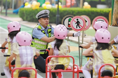 日前,河北省邢臺(tái)市內(nèi)丘縣交警、消防等部門走進(jìn)內(nèi)丘縣第三幼兒園,引導(dǎo)孩子們辨識(shí)交通安全標(biāo)志、認(rèn)識(shí)消防器材、學(xué)唱交通安全歌,為孩子們送去“安全大禮包”。圖為交警引導(dǎo)孩子們學(xué)習(xí)交通安全知識(shí)。通訊員 劉繼東 攝