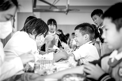近日,在浙江省溫州市第二實驗小學,醫(yī)護人員給學生進行健康體檢。當天,浙江省溫州市鹿城區(qū)濱江街道黎明社區(qū)衛(wèi)生院組織醫(yī)護人員來到溫州市第二實驗小學,為該校學生提供“一站式”免費體檢服務(wù)。近年來,溫州市中小學校每年定期組織開展學生體檢工作,并為每位學生建立了健康檔案,及時準確掌握學生體質(zhì)發(fā)展動態(tài)。 劉吉利 攝