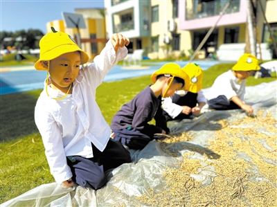 秋天稻谷飄香,為了讓孩子們體驗(yàn)豐收的喜悅,日前,浙江省武義縣白陽幼兒園開展了收割稻谷勞動(dòng)實(shí)踐活動(dòng)。孩子們和老師一起割稻谷、拾稻穗、打稻谷,他們開動(dòng)腦筋,用輪胎、梯子、洗衣板等材料完成了稻谷的脫粒,把一顆顆金黃色的谷粒收集到一起晾曬。幼兒園供圖