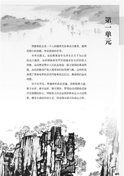 中職語文統(tǒng)編教材針對(duì)文本單元,根據(jù)培養(yǎng)學(xué)生的“理想信念”“文化自信”“責(zé)任擔(dān)當(dāng)”的核心目標(biāo),凝練出來的17個(gè)單元立意,系統(tǒng)體現(xiàn)了重大主題教育的相關(guān)內(nèi)容。單元立意是組織單元和選擇課文的重要線索之一。每個(gè)單元的單元導(dǎo)語,都會(huì)在第一自然段對(duì)本單元的立意進(jìn)行解析,并在其他自然段的特定位置對(duì)本單元的人文目標(biāo)作出明確表述,從而讓教師和學(xué)生能夠有意識(shí)地用這條線將單元中的各個(gè)板塊貫通起來,形成育人合力。