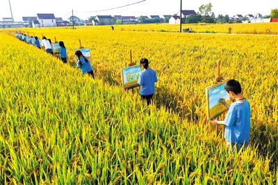 近日,江蘇省如皋市丁堰鎮(zhèn)劉海小學(xué)的學(xué)生們?cè)诮鹕牡咎锢镉卯?huà)筆描繪家鄉(xiāng)豐收美景。該校教師帶著繪畫(huà)社團(tuán)的學(xué)生們來(lái)到稻田里“畫(huà)豐收”,感受秋天的氣息。徐慧 攝
