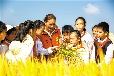 近日,江蘇省海安市大公鎮(zhèn)中心小學(xué)學(xué)生在田間聽教師講解水稻種植知識(shí)。豐收時(shí)節(jié),學(xué)生們?cè)诮處煹膸ьI(lǐng)下到田間學(xué)農(nóng)識(shí)、習(xí)農(nóng)耕、做農(nóng)事,感受勞動(dòng)樂(lè)趣,知曉每一粒糧食的來(lái)之不易。翟慧勇 攝