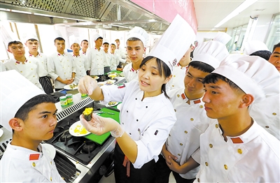 日前,在河北省張家口市職業(yè)技術(shù)教育中心北校區(qū)烹飪實(shí)訓(xùn)樓里,35名來(lái)自新疆維吾爾自治區(qū)和碩縣高級(jí)中學(xué)職業(yè)高中班的學(xué)生,有的在把土豆切成滾刀塊,有的在把紅尖椒去籽、洗凈、切成菱形片。當(dāng)天的課程是新疆大盤(pán)雞實(shí)操練習(xí),學(xué)生們按照教師的要求正熱火朝天地忙活著。