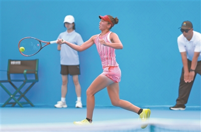 11月8日,第一屆學(xué)青會網(wǎng)球女子團體決賽在廣西體育中心網(wǎng)球中心進行,北京東城區(qū)隊2∶0擊敗武漢隊,奪得學(xué)青會網(wǎng)球賽的首塊金牌。圖為北京東城區(qū)隊張筠涵在比賽中。