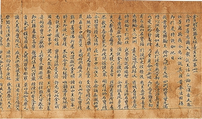 華中師范大學(xué)博物館收藏的這卷敦煌遺書為《金光明經(jīng)》,又名《金光明最勝王經(jīng)》,是大乘佛教中有著重要影響力的經(jīng)典之一,卷首寫有“金光明最勝王經(jīng)善生王品第二十一”,卷尾寫有“金光明經(jīng)卷第九,三藏法師威儀”。該經(jīng)卷歷經(jīng)千年仍保存完好,全卷干凈整潔,無缺損蟲蛀,實(shí)屬難得精品,具有很高的文獻(xiàn)價(jià)值、史料價(jià)值。卷面字體筆力蒼勁,穩(wěn)重剛勁,舒展自然,同時也具有很高的書法價(jià)值。