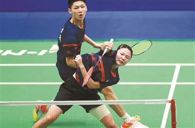 11月11日,第一屆學(xué)青會(huì)(公開組)羽毛球賽決賽在廣西南寧進(jìn)行,在混合雙打?qū)Q中,來自廣州隊(duì)的高家炫和李茜以2∶0戰(zhàn)勝來自長(zhǎng)沙隊(duì)的毛哲和劉圓圓,獲得冠軍。圖為高家炫和李茜在比賽中。本報(bào)記者 張學(xué)軍 攝