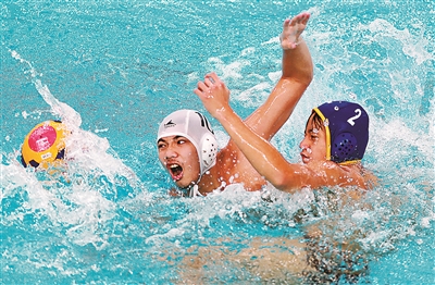 11月14日,第一屆學青會(公開組)男子水球項目比賽在南寧進行,廣西北海市隊(白帽)以18:17的比分險勝上海楊浦區(qū)隊(藍帽)。圖為比賽現(xiàn)場。本報記者 張學軍 攝