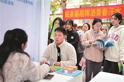 11月15日,學生在重慶市2024屆普通高校畢業(yè)生就業(yè)雙選會(商貿(mào)流通類專場)上與用人單位交流。本次雙選會有160家優(yōu)質(zhì)企業(yè)參會,提供崗位7812個,共有5100余名應(yīng)屆畢業(yè)生到場應(yīng)聘。孫凱芳 攝