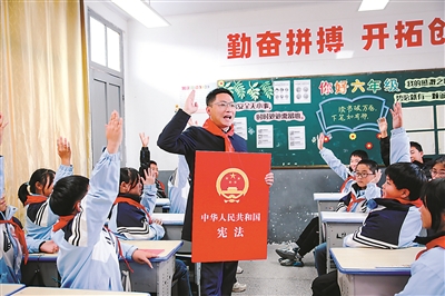 12月4日,在江蘇省如皋市下原鎮(zhèn)山珀小學(xué),學(xué)生參與憲法知識競答。在第十個國家憲法日,如皋市教育局通過開展豐富多彩的憲法主題教育宣傳進(jìn)校園活動,為學(xué)生普及憲法知識,增強(qiáng)法治觀念,弘揚(yáng)憲法精神。