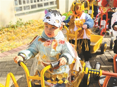 陳鶴琴先生說,大自然、大社會(huì)都是活教材。日前,浙江省杭州市蕭山區(qū)開悅幼兒園的孩子們將童話劇場搬進(jìn)大自然,或唱、或跳、或演,用陽光、大樹、葉子編織一個(gè)個(gè)童話夢。圖為孩子們化身童話劇《鴨子騎行記》中快樂騎行的鴨子,并用落葉裝扮自己。傅凱懿 圖 吳潤之 文