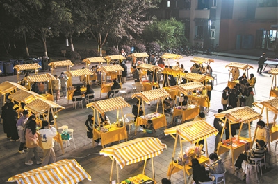 近日,重慶商務(wù)職業(yè)學(xué)院的學(xué)生們在夜市購物。今年10月以來,該校開展市集活動,開辟64個攤位,讓在校生成為攤主,經(jīng)營項目包括校園文創(chuàng)、手工制品等,以此全方位提高學(xué)生“雙創(chuàng)”技能。孫凱芳 攝