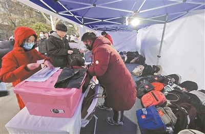 在中國傳媒大學(xué),考場教學(xué)樓前支起幾十個(gè)帳篷,每個(gè)帳篷上標(biāo)記著考場號碼,方便學(xué)生擺放書包時(shí)“對號入箱”,每個(gè)帳篷里還配備了專門的志愿者負(fù)責(zé)引導(dǎo)和服務(wù),每名考生都有一個(gè)印著考場和座位號的貼紙,一式兩份,考生取包時(shí)需要出示號碼取走物品。