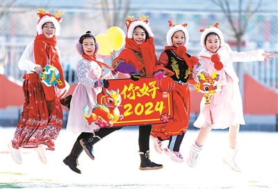 新年到來之際,內(nèi)蒙古自治區(qū)呼和浩特市玉泉區(qū)南柴火市街小學(xué)學(xué)生手持“你好2024”字樣,喜迎新年。近日,該校開展“慶元旦 ”主題活動,師生們通過拼裝燈籠、歌舞快閃、拍攝創(chuàng)意合影等方式,在歡聲笑語中迎接2024年的到來。丁根厚 攝