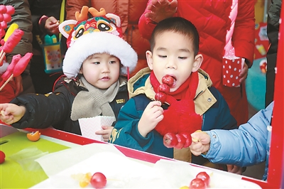 近日,中國兒童中心實驗幼兒園舉辦了第四屆“冬之語”活動,老師們把廟會“搬進”了幼兒園。教學樓大廳、藝術宮一層走廊里,熙熙攘攘,熱鬧非凡;美食一條街上,糖葫蘆、棉花糖、爆米花飄出陣陣香氣;孩子們創(chuàng)作的年畫充滿童趣;愛心義賣場人頭攢動……在真實體驗中,孩子們感受年俗、共享年趣。圖為孩子們品嘗手工制作的糖葫蘆。楊麗莎 攝