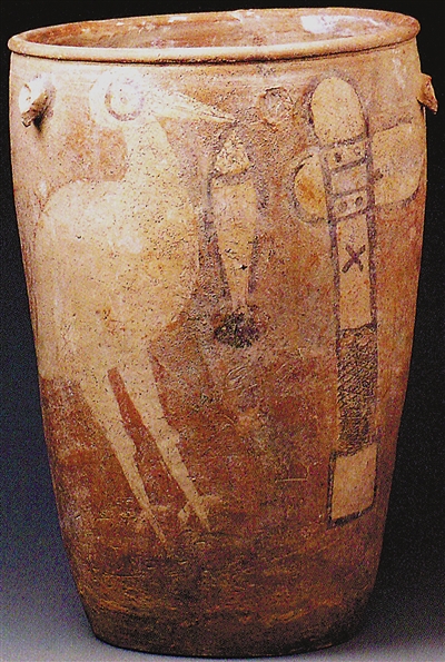 河南汝州閻村出土、現(xiàn)藏中國國家博物館的仰韶文化《鸛魚石斧紋陶缸》,距今約5000多年,高47厘米,口徑32.7厘米,在彩陶里算是器型很大的作品。陶缸的側(cè)面,繪有一只白色鸛鳥,雙腿直立,身體粗壯,眼睛圓瞪,口中銜著一條大魚,鳥的前方,還繪有一件綁在棍棒上的斧鉞,繪畫的風格非常寫實。鳥銜魚的畫面,讓人不禁聯(lián)想到清代著名詞人納蘭性德的《摸魚兒·午日雨眺》:“臺榭空蒙煙柳暗,白鳥銜魚欲舞?!兵B和魚的組合,三國曹魏時期玄學家何晏曾在《景福殿賦》中詠唱:“悠悠玄魚,??白鳥?!焙髞?,白鳥銜魚則成為唐詩中的一個典故,唐代詩人劉長卿《青溪口送人歸岳州》詩曰:“洞庭何處雁南飛,江菼蒼蒼客去稀。帆帶夕陽千里沒,天連秋水一人歸。黃花裛露開沙岸,白鳥銜魚上釣磯。歧路相逢無可贈,老年空有淚沾衣?!睆脑姼鑳?nèi)容來看,白鳥銜魚跟送別的意象是連接在一起的。不過,生活在仰韶時代的早期先民對后世的這種詩意,恐怕是體會不到的,然而,這個陶罐的具體用途是葬具,也可以說是另外一個層面的送別吧。