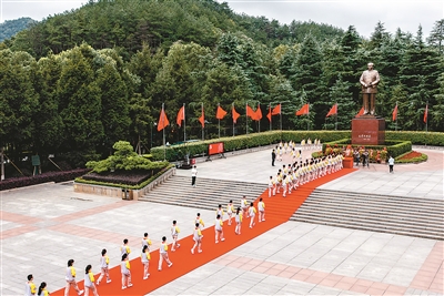 在主持人引導(dǎo)下,學(xué)生們依次進(jìn)行了整隊(duì)、合唱、宣誓、獻(xiàn)花等儀式。他們洪亮的歌聲久久在廣場(chǎng)上空、青山之間回響:“沒有共產(chǎn)黨就沒有新中國(guó),沒有共產(chǎn)黨就沒有新中國(guó),共產(chǎn)黨辛勞為民族……”