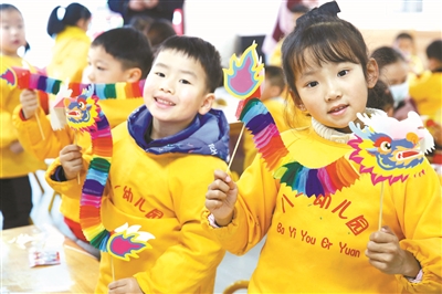 日前,江蘇省連云港市連云區(qū)墟溝街道南山社區(qū)與轄區(qū)八一幼兒園聯(lián)合開展“巧手做舞龍 傳承龍文化”主題活動。孩子們在志愿者引導(dǎo)下,用靈巧的小手,對材料進行拼接、粘貼,制作出一條條漂亮的拉花舞龍。圖為孩子們在展示自己的作品。通訊員 朱華南 攝