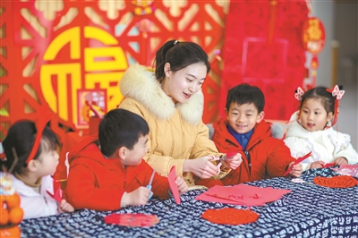 1月22日,在江蘇省興化市昭陽(yáng)湖幼兒園,教師指導(dǎo)小朋友剪窗花。寒假臨近,該幼兒園開(kāi)展豐富多彩的活動(dòng),孩子們?cè)诮處煹闹笇?dǎo)下寫(xiě)“福”字、剪窗花,體驗(yàn)民俗,喜迎新春佳節(jié)。周社根 攝