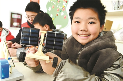 近日,在江蘇省鎮(zhèn)江市官塘橋街道“平平假日課堂”,一名小朋友展示大學(xué)生志愿者指導(dǎo)他制作的太陽能月球車模型。 石玉成 攝