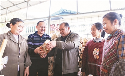 羅兆生的基地主要通過“高校+農(nóng)業(yè)龍頭企業(yè)產(chǎn)學(xué)研用推融合”的模式發(fā)展。廣西大學(xué)提供指導(dǎo)服務(wù),企業(yè)統(tǒng)一提供優(yōu)質(zhì)種源、菌棒、種植技術(shù)指導(dǎo)、經(jīng)營管理,帶動(dòng)企業(yè)和農(nóng)戶規(guī)?;?、標(biāo)準(zhǔn)化發(fā)展,促進(jìn)農(nóng)業(yè)增效、農(nóng)民就業(yè)和增收。在基地,有20多名工人從事生產(chǎn),大都是附近的村民。負(fù)責(zé)段木加工的四榮鄉(xiāng)南團(tuán)村村民梁楚娟說:“每個(gè)月工資四五千,下班還能在家看小孩,比去外面打工強(qiáng)多了。”這也使當(dāng)?shù)赜辛艘痪漤樋诹铮骸吧嫌辛?,下有靈,老百姓越過越開心。”