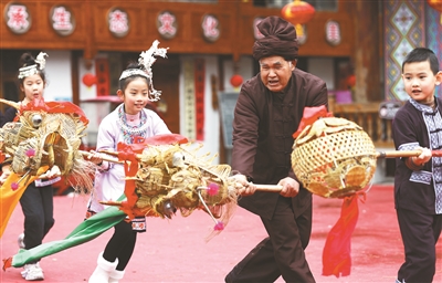 2月4日,廣西桂林市龍勝各族自治縣平等鎮(zhèn)廣南村,村里的老人帶孩子們一起舞草龍。立春當日,廣南村的侗族老少身著盛裝,舉行鬧春牛、春牛巡游祈福、舞草龍、演唱琵琶歌等民俗活動,喜迎新春到來。粟勇主 攝