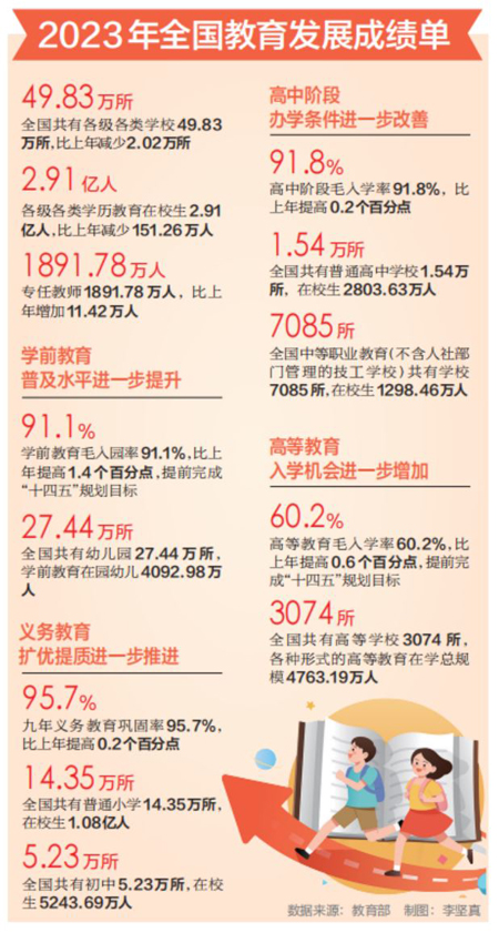 2023年,九年義務(wù)教育鞏固率95.7%,比上年提高0.2個(gè)百分點(diǎn);高中階段毛入學(xué)率91.8%,比上年提高0.2個(gè)百分點(diǎn);特殊教育學(xué)校數(shù)量比上年增長1.34%;學(xué)前教育毛入園率和高等教育毛入學(xué)率均提前完成“十四五”規(guī)劃目標(biāo),分別達(dá)到91.1%和60.2%。