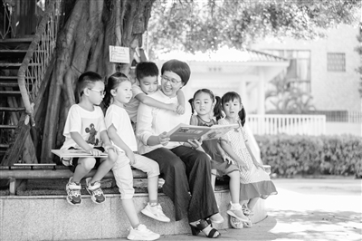 她和孩子們?cè)诤┻呉黄鸨寂?,一起聽大海的歌唱;在榕樹下講故事,在陽光下找影子,一起捉迷藏;孩子們用芭蕉葉做小道具,用長(zhǎng)板凳做蹺蹺板……每一個(gè)孩子的臉上都是燦爛的笑容,眼里都有明亮的光芒。